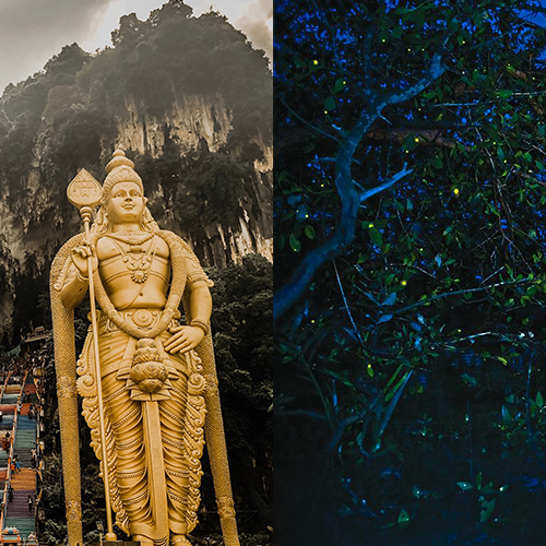 BATU CAVES is an iconic and popular tourist attraction in Selangor. Site of an Hindu temple and shrine, a limestone outcrop, Batu Caves has the main attraction is the large statue of the Hindu god at the entrance, beside a stairs 272 climb up its steps to finally view the stunning skyline of the city center. Monkeys frolic around the caves, TEMPLER PARK the natural tropical with lawn interspersing is a picture of tranquility and peace. mountain waterfalls, natural pools and tumbling Streams are good swimming grounds. KUALALUMPUR FIREFLY a drive through the countryside past green oil palm and rubber.